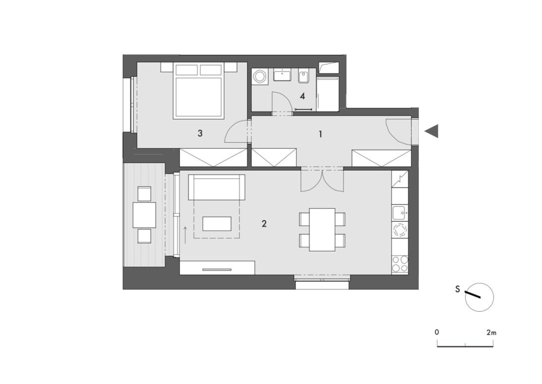 Apartmán o dispozici 2+kk je vhodný pro 2 až 4 osoby a nabízí prakticky řešený interiér. Dominantou bytu je obývací pokoj s kuchyňským koutem o velikosti 29,9 m², ze kterého je přímý vstup na lodžii o ploše 5,5 m². Dispozice dále zahrnuje prostornou chodbu s dostatkem úložných prostor a samostatnou ložnici o rozloze 13,4 m². Lodžie je orientována na severozápad, což zajišťuje příjemné odpolední a večerní světlo.