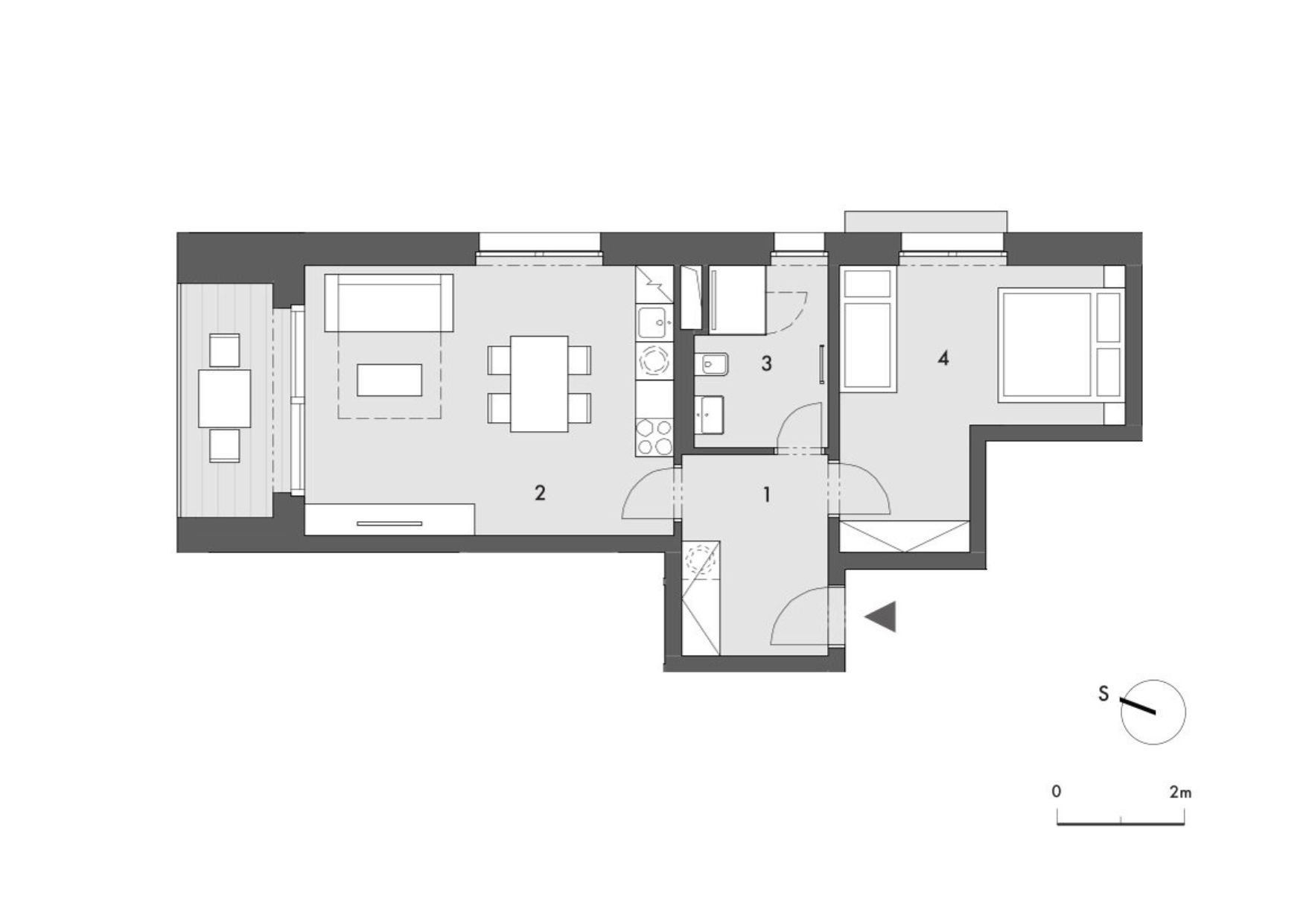 Apartmán 2+kk je ideální volbou pro 2 až 4 osoby a vyniká funkčním a promyšleným uspořádáním. Hlavní obytný prostor tvoří obývací pokoj s kuchyňským koutem o rozloze 24,5 m², z něhož je přímý vstup na lodžii o velikosti 5,5 m². Součástí dispozice je také samostatná ložnice o ploše 15,3 m², která pohodlně pojme manželskou postel i samostatné lůžko. Severozápadní orientace lodžie přináší příjemné světlo zejména v odpoledních a večerních hodinách.