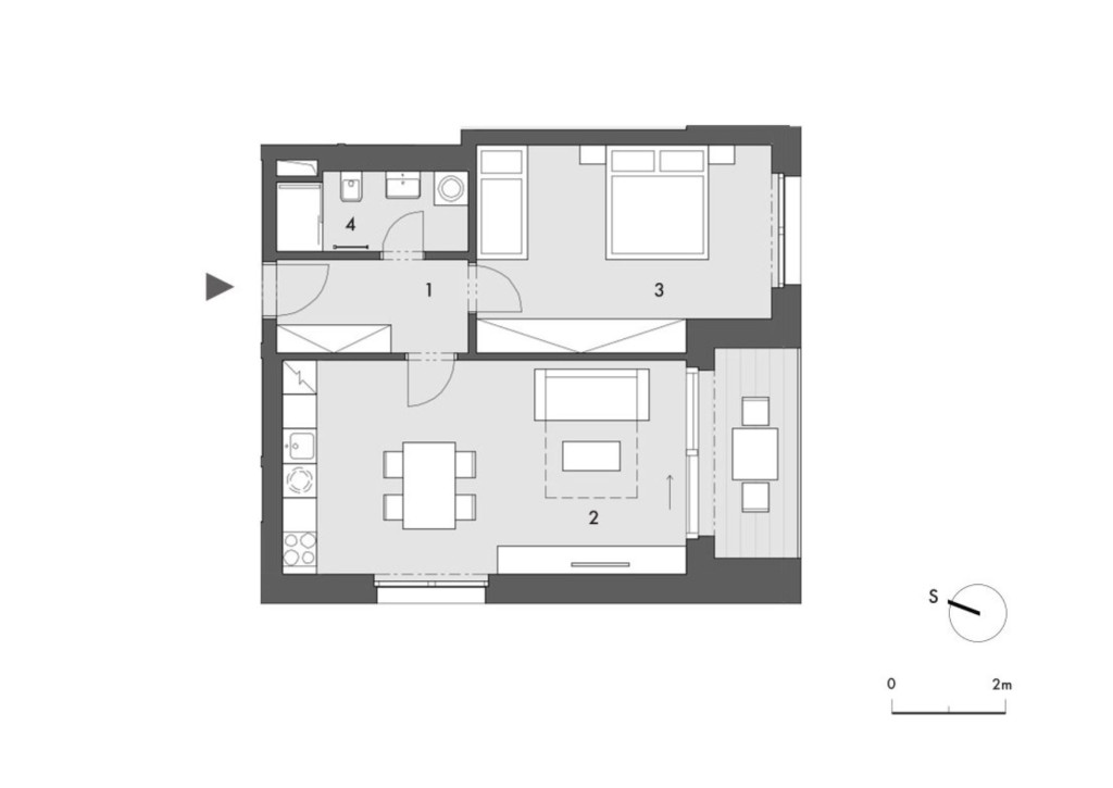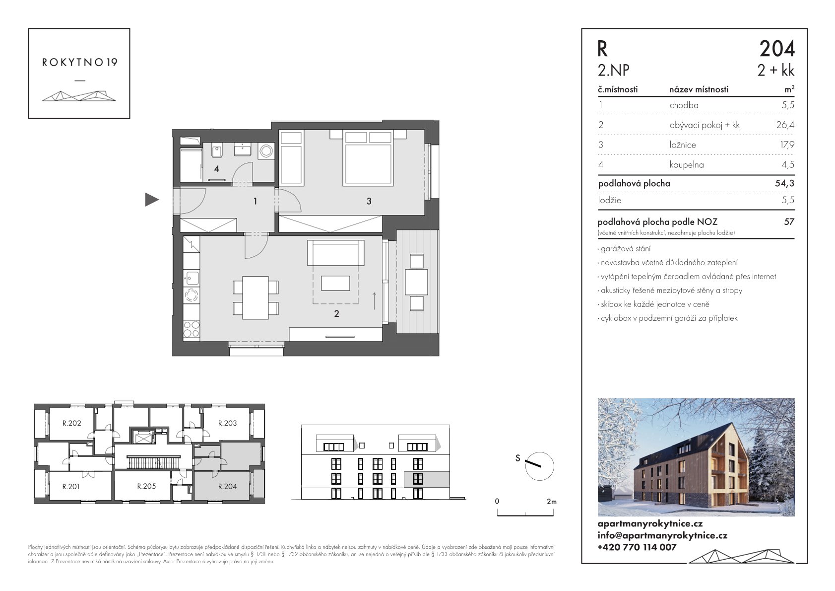 Apartmán 2+kk je ideální pro 2 až 4 osoby. Prostorný obývací pokoj s kuchyňským koutem o velikosti 26,4 m² je hlavním centrem bytu a zajišťuje přímý přístup na lodžii o ploše 5,5 m² orientovanou na jih. Obývací prostor doplňuje francouzské okno s výhledem na jihozápad, které přináší příjemné světlo. Samostatná ložnice o rozloze 17,9 m² pohodlně pojme manželskou postel i samostatné lůžko.