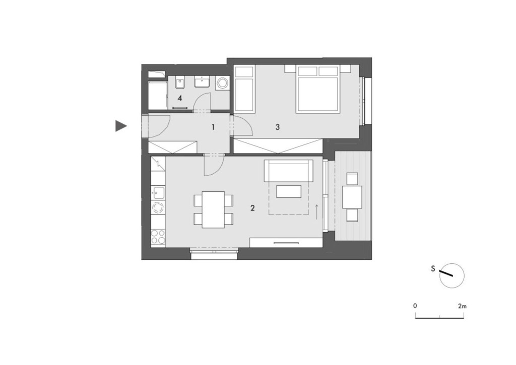 Apartmán 2+kk je ideální pro 2 až 4 osoby. Prostorný obývací pokoj s kuchyňským koutem o velikosti 26,4 m² je hlavním centrem bytu a zajišťuje přímý přístup na lodžii o ploše 5,5 m² orientovanou na jih. Obývací prostor doplňuje francouzské okno s výhledem na jihozápad, které přináší příjemné světlo. Samostatná ložnice o rozloze 17,9 m² pohodlně pojme manželskou postel i samostatné lůžko.